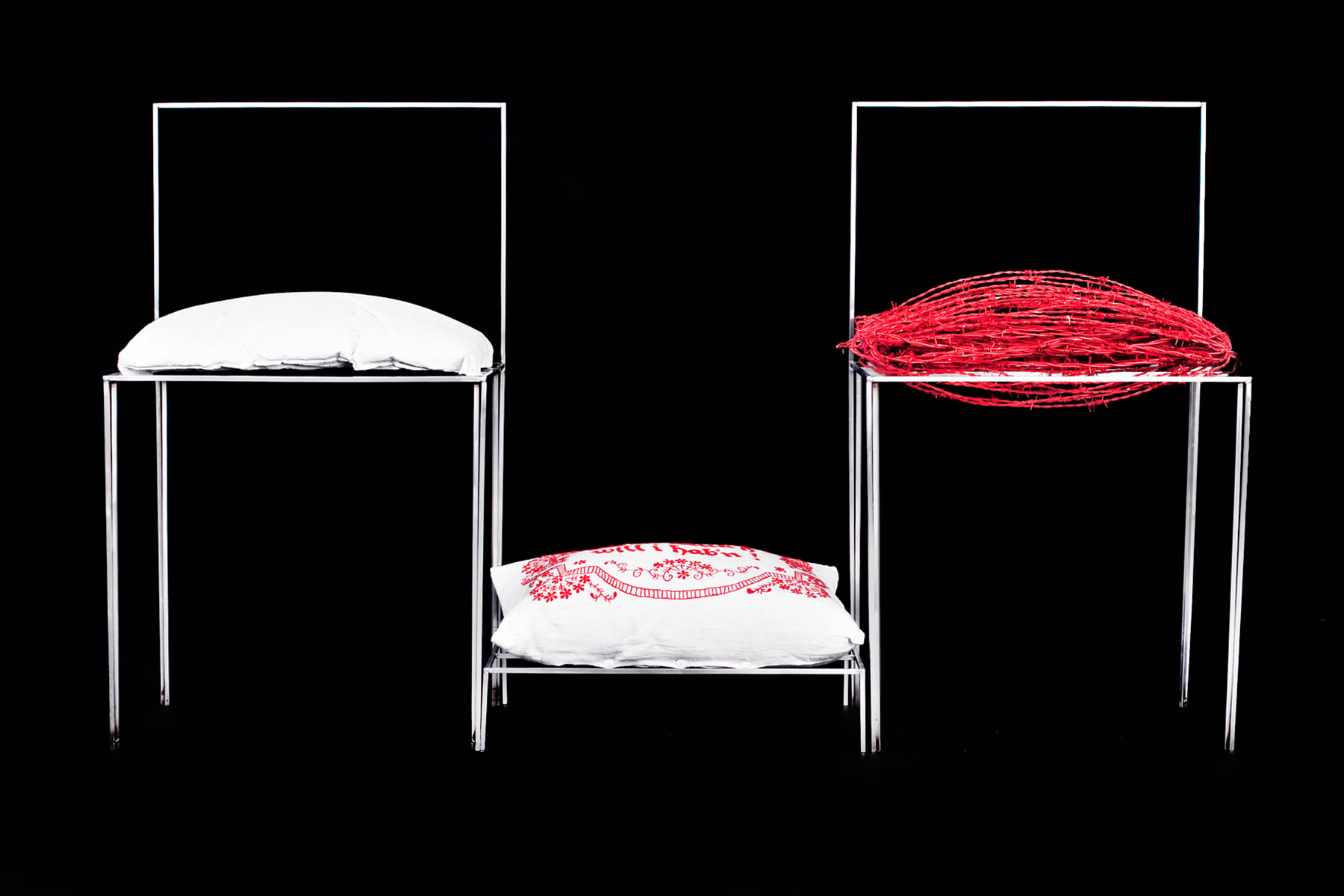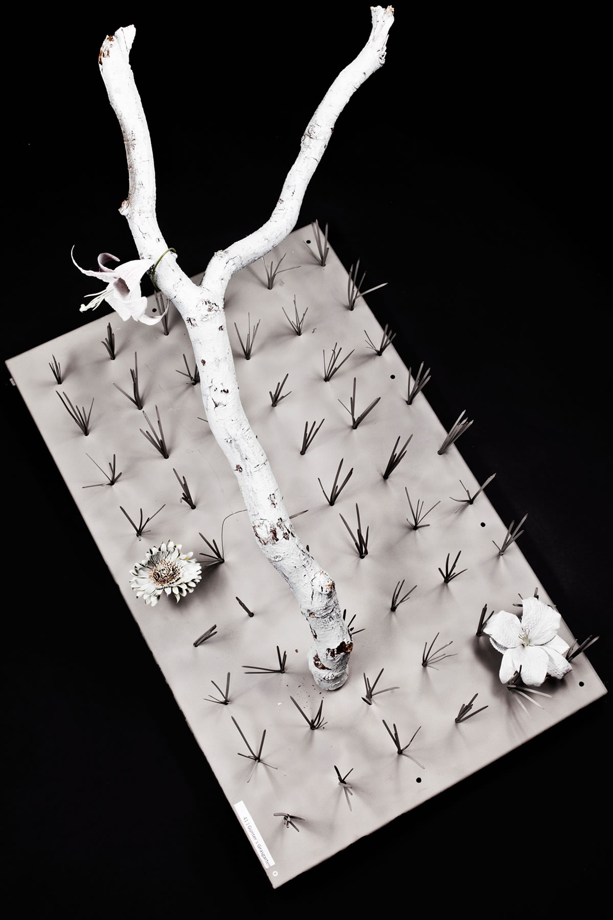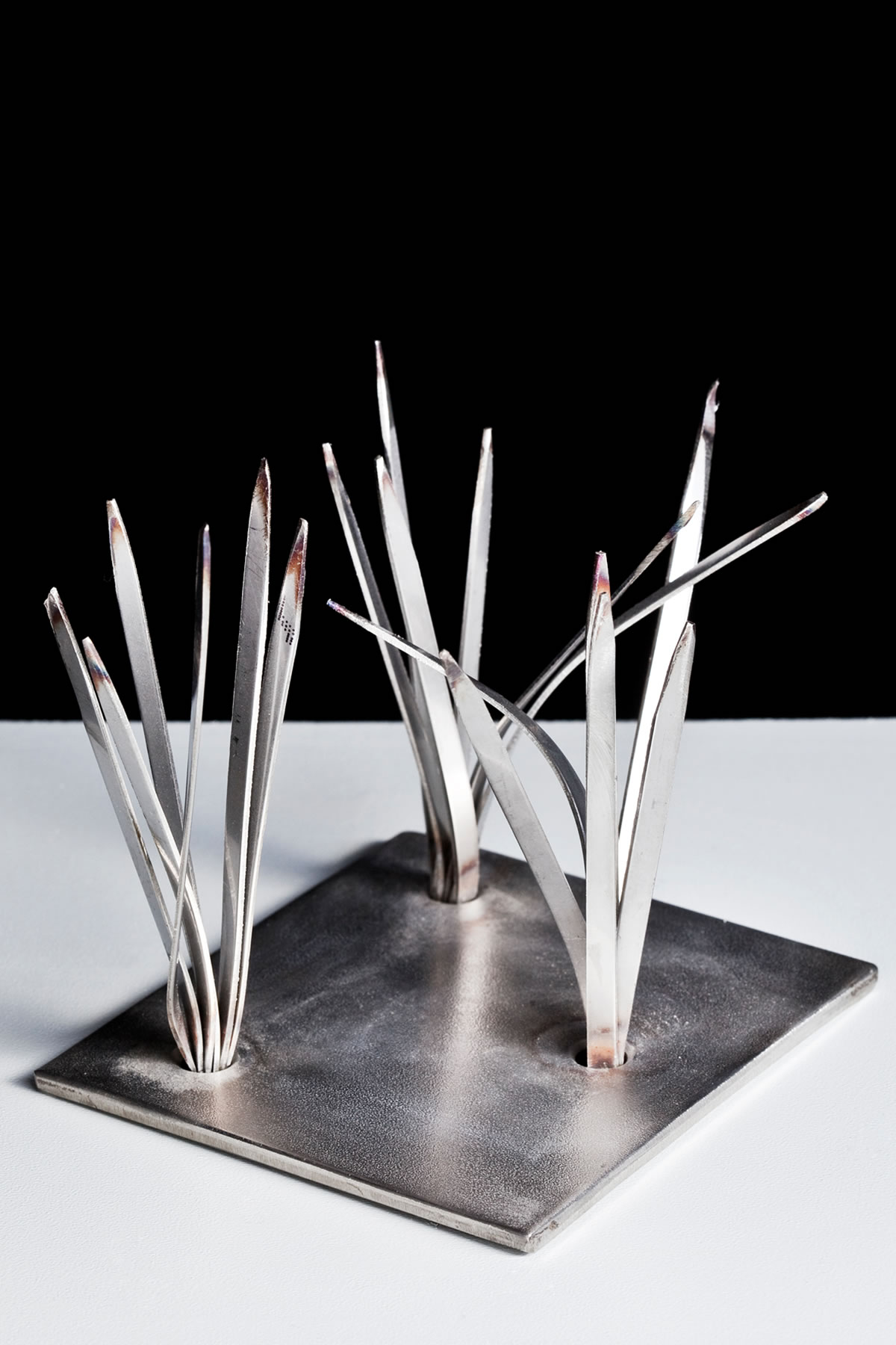 Maße: 45x45x75 cm (2 Teile), 45x45x15 cm (1 Teil). Material Edelstahl, Beton, Stacheldraht, Textil.