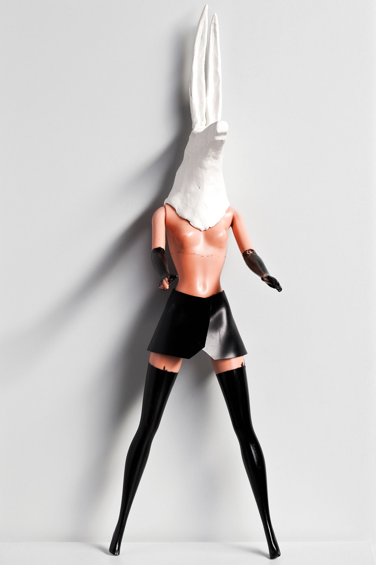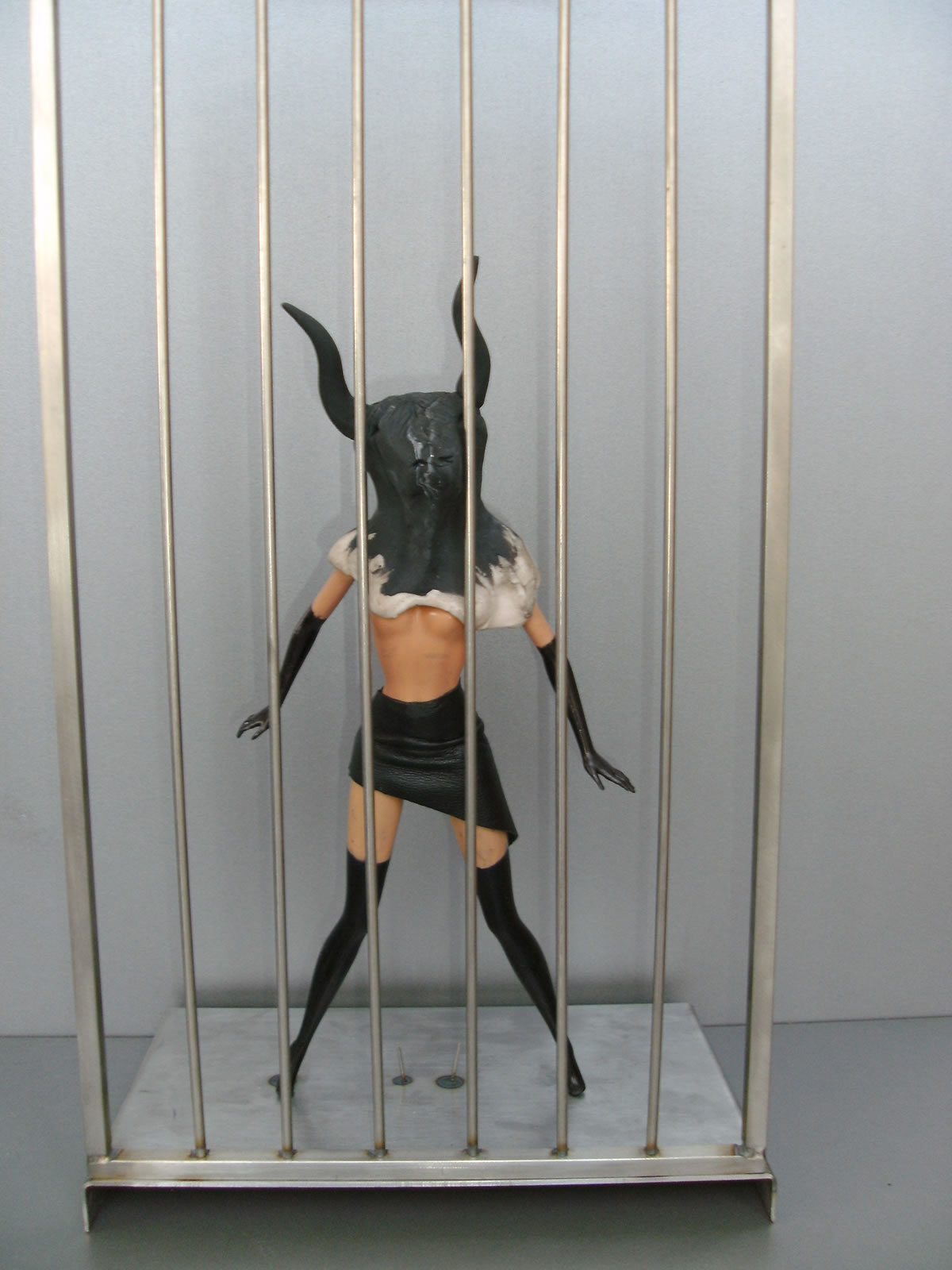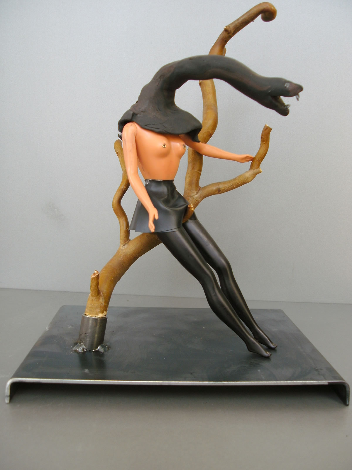 Mythologisches Mischwesen. Maße: ca. 25x15x50 cm. Material Stahl, Barbie-Puppe, Modelliermasse.